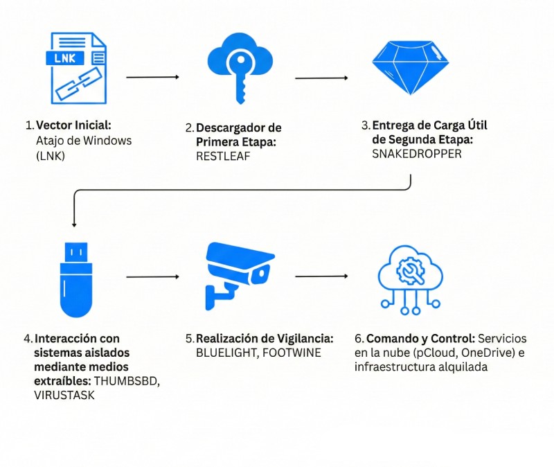 La cadena de infección inicial apunta a equipos perimetrales conectados a internet mediante un archivo de acceso directo (LNK) malicioso. Al ejecutarse, despliega un script de PowerShell que muestra un documento señuelo sobre el conflicto palestino-israelí, mientras carga en segundo plano el primer componente: RESTLEAF. Este implante establece comunicación con la infraestructura atacante utilizando la plataforma legítima Zoho WorkDrive, descargando posteriormente un shellcode cifrado que introduce el cargador de segunda etapa denominado SNAKEDROPPER.